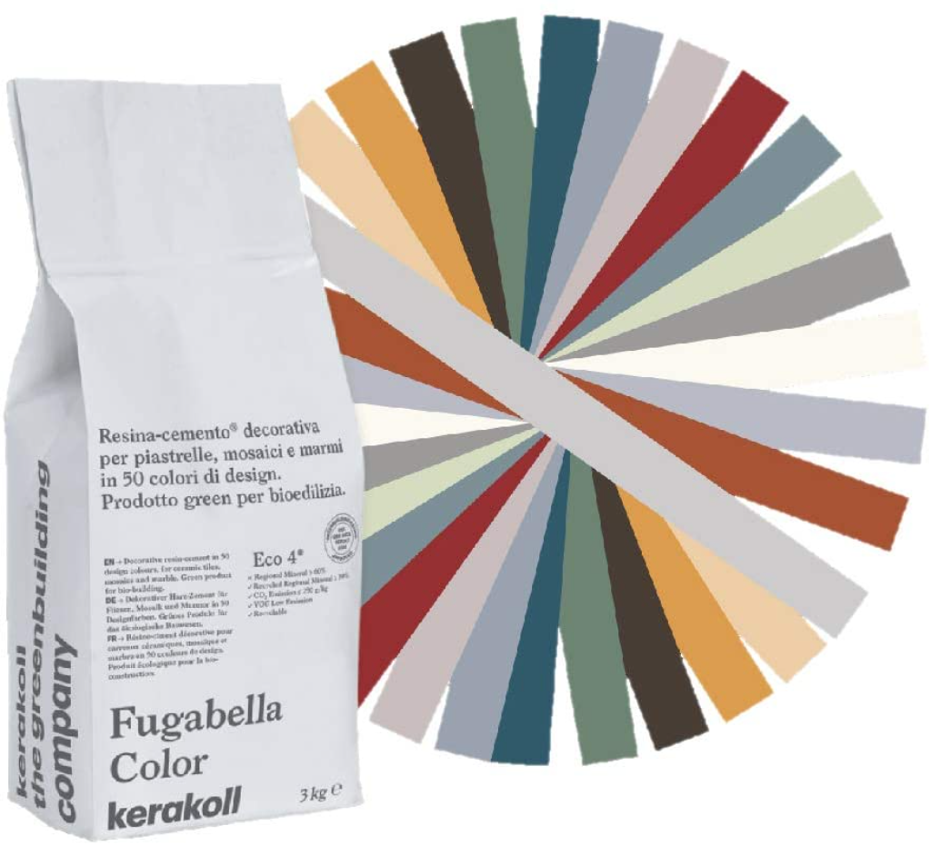 Kerakoll Fugabella Color Grout არის დეკორატიული ფისოვანი ცემენტის გრუტი კერამიკული და ფაიფურის ფილების, მოზაიკის და ბუნებრივი ქვის დასაბანად, ხელმისაწვდომია 50 ფერის დიზაინის დიაპაზონში. მწვანე პროდუქტი ბიოშენებისთვის.